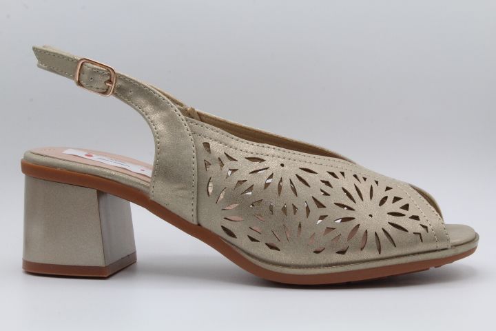 Sandalia mujer metalizada en suave poli piel con tacón ancho y cómodo de 6cm.